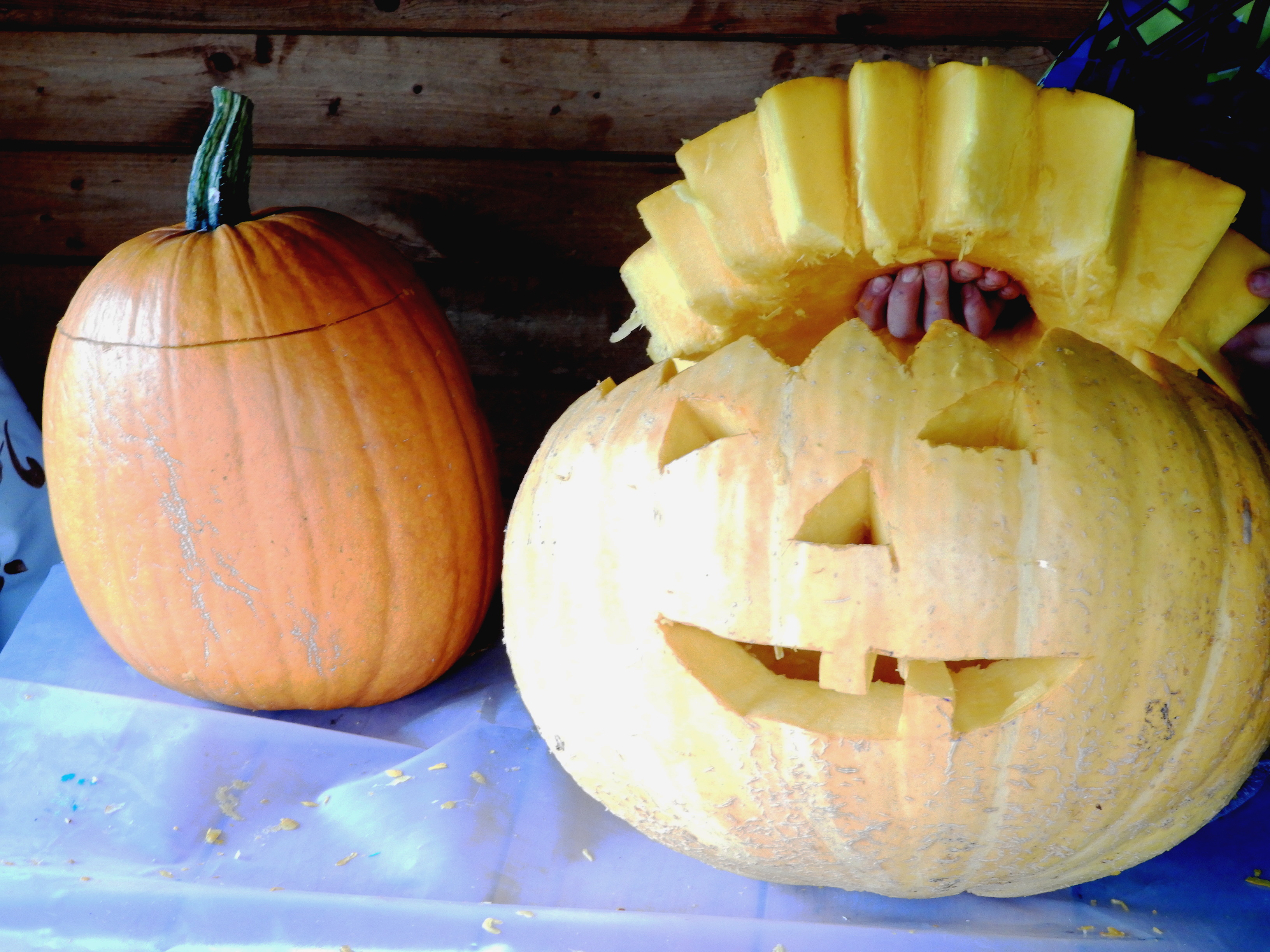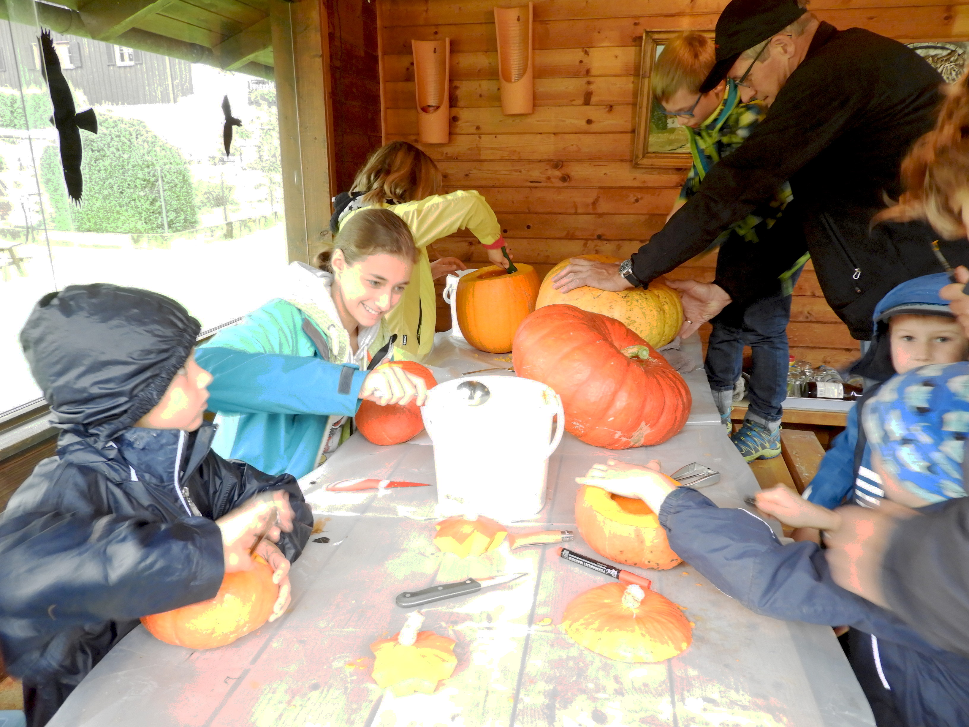 Die mitgebrachten Kürbisse wurden anschließend kunstvoll ausgehöhlt und mit einem lustigen Gesicht verziert. Zum Abschluss gab es heiße Kürbissuppe für alle.